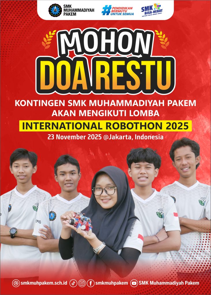 SMK Muhammadiyah Pakem mengumumkan kesiapan kontingen terbaik mereka untuk berkompetisi di ajang bergengsi International Robothon 2025. Kompetisi robotika tingkat internasional ini akan diselenggarakan pada tanggal 23 November 2025 di Jakarta, Indonesia.